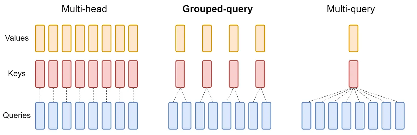 GQA is a middle-ground between multi-head and multi-query. We still have n heads for queries, but we split the KV-cache into g groups. Thus, we have n/g heads per group.