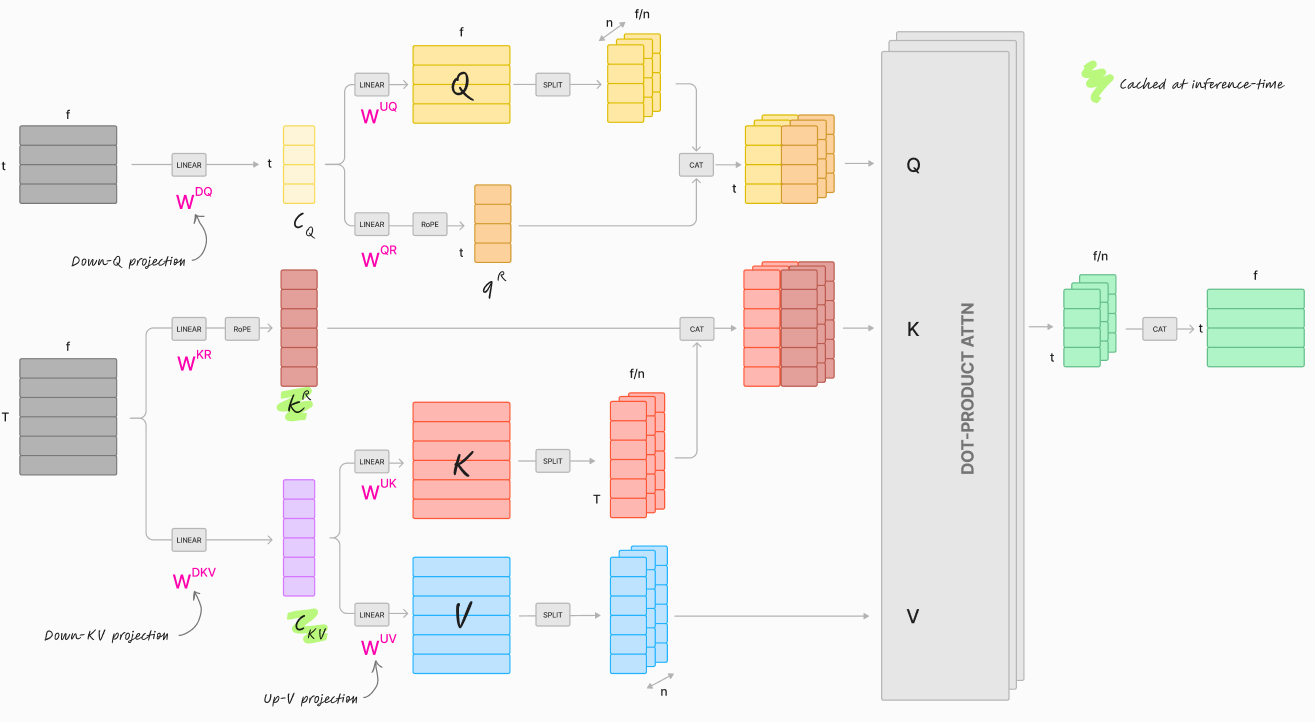 QandK. The main advantage is that we can just cache this projection \(c_{KV}\) which is much smaller than the naive completeKV-cacheat inference-time.It applies the same principle for