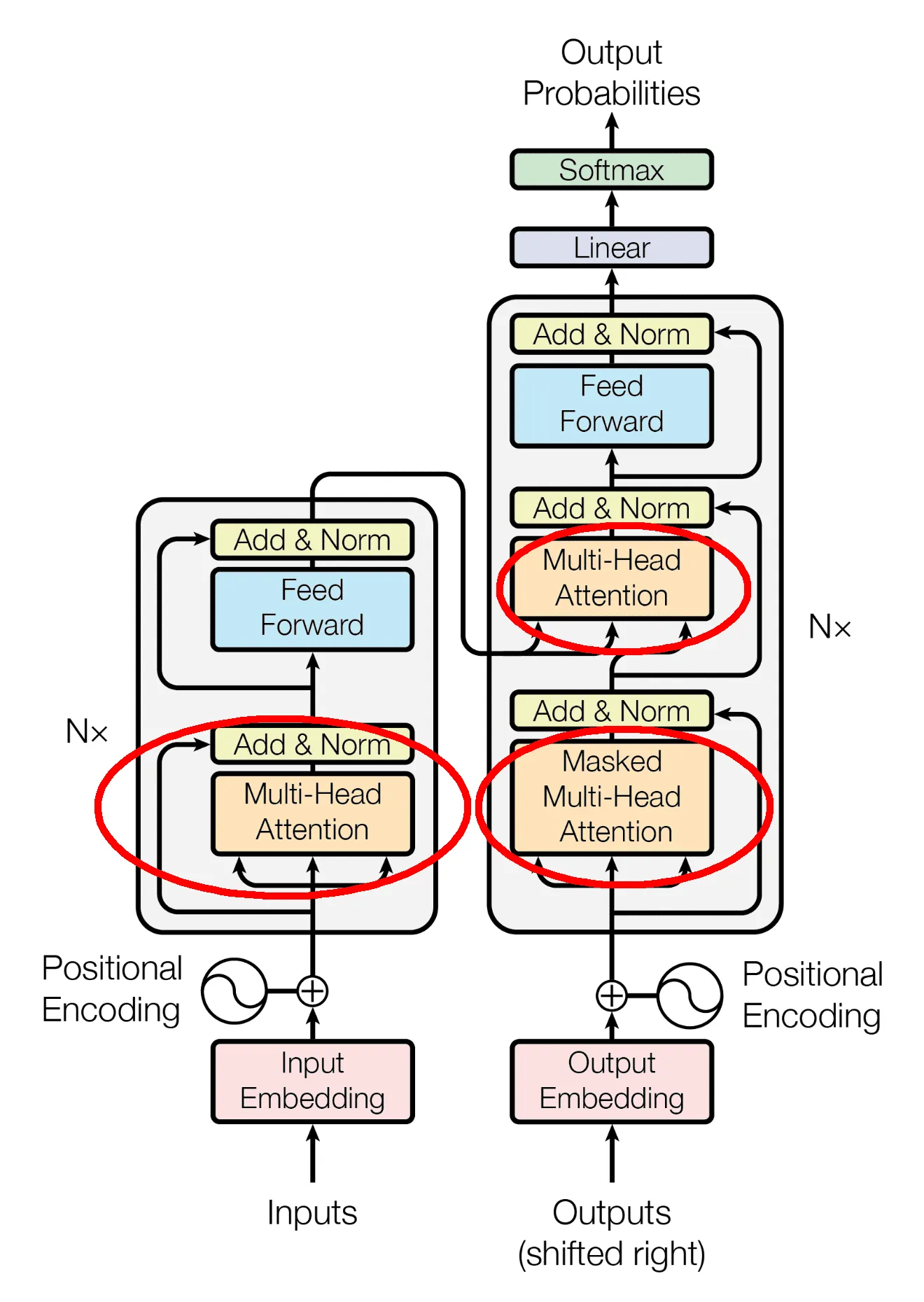 At the core of the circled multi-ehad attention layers we find the dot-product attention. I talk extensively2 about this in the sequence post. Here you can find an over-simplified diagram of how it works3: