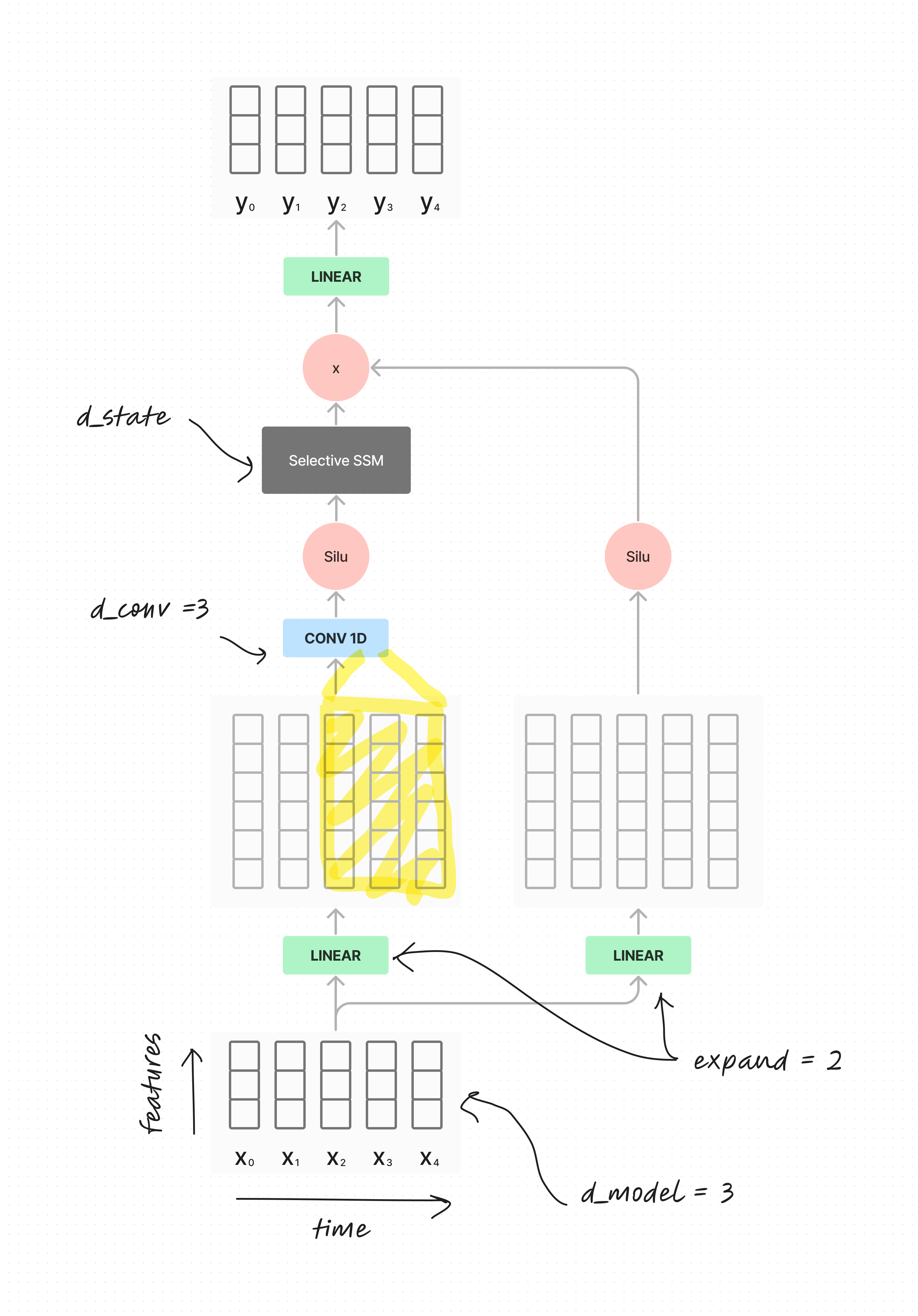 If you check the official implementation. Specfically, the mamba block, you’ll see this important parameters: d_model (input and output dimensions), d_state (SSM hidden state dim), d_conv (conv-1d kernel size), expand (initial projection expansion factor). I referenced them in the diagram.