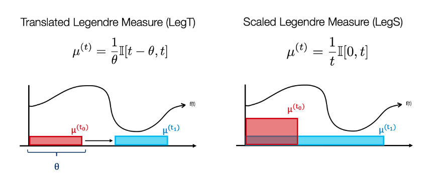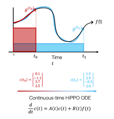 Summary of the HiPPO framework under LegS measure: The projection coefficients evolve through time according to a linear dynamical system. represents the reconstructed function (linear combination of basis elements according to ). The colored boxes represent the used metrics (weight given through time).