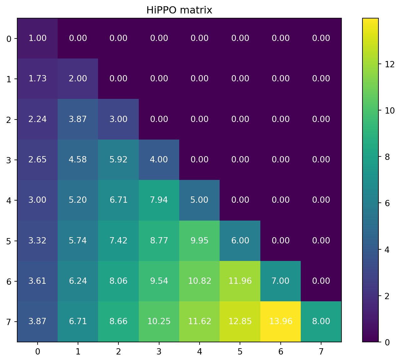 # Please don't judge the code, its all chatgptimport numpy as npimport matplotlib.pyplot as pltdef generate_matrix(N): A = np.zeros((N, N)) # Initialize a N x N matrix with zerosfor n inrange(N):for k inrange(N):if n > k: A[n, k] = np.sqrt((2*n +1)*(2*k +1))elif n == k: A[n, k] = n +1else: A[n, k] =0# This line is technically not needed as the matrix is initialized with zerosreturn A# For example, generate a 5x5 matrixN =8matrix = generate_matrix(N)plt.figure(figsize=(9, 7))plt.imshow(matrix, cmap='viridis', aspect='equal')plt.colorbar()plt.title("HiPPO matrix")# Annotate the heatmap with matrix valuesfor i inrange(N):for j inrange(N): text = plt.text(j, i, f"{matrix[i, j]:.2f}", ha="center", va="center", color="w")plt.show()
