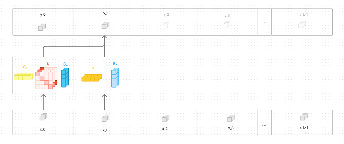 T =len(x)h[0, :] = B_bar[:] * x[:] # Broadcasted for all tfor i inrange( log_2(T) ):for t inrange(T) DO IN PARALLEL:if t <2^i: h[i, t] = h[i-1, t]else: A_acc = A[t] * A[t -1] * ... * A[t -2^i +1] h[i, t] = h[i-1, t] + A_acc * h[i-1, t -2^i]