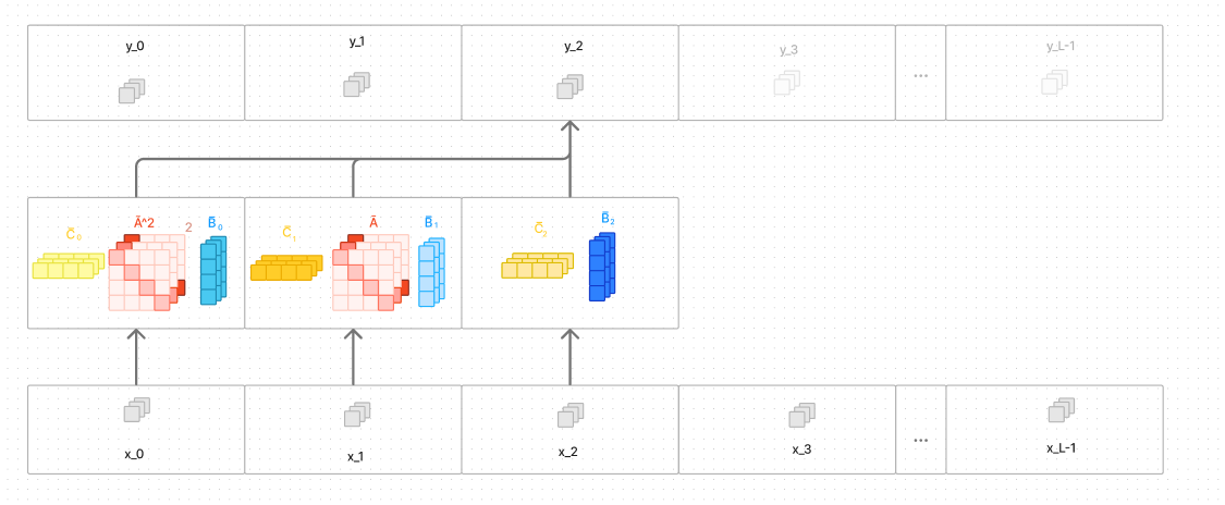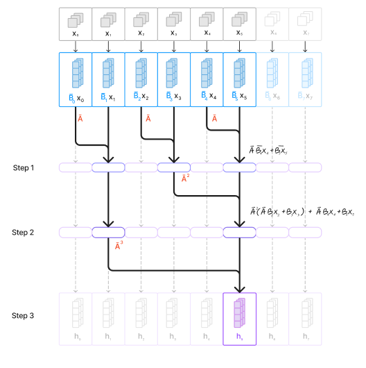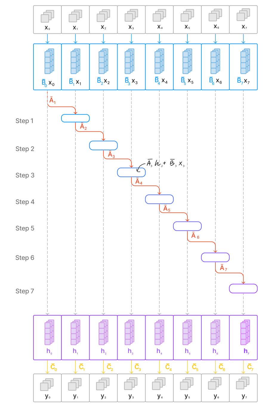 First we compute B_bar[t] * x[t]. This is a tensor multiplication without previous time-step dependencies, which can easily be parallelized. Then, for the iterative part, at every step t we take the output of the previous step h[t-1], we multiply by A_bar and add B_bar[t] * x[t], which gives us h[t]. Notice that we need 8 steps to compute the output of a sequence of length 8.