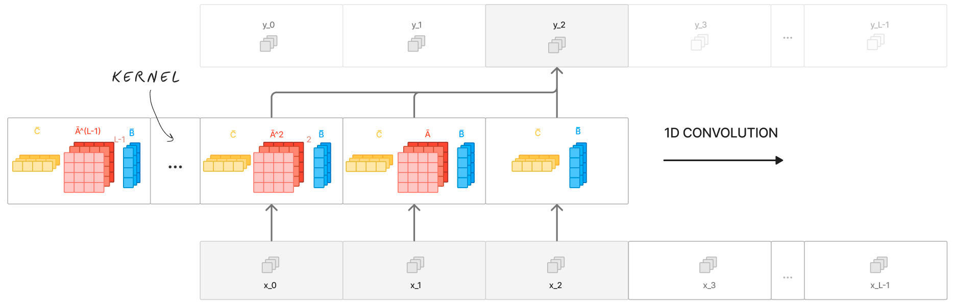 To make it apparent that dimensions of input and output pairs are independent, I represent them as “batched”. In this example: input_dim = output_dim = 3, and hidden_dim = 4. Thus, we get 3 kernels of dimension 1xL, which we apply in parallel.