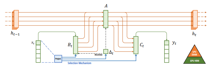 Hardware-aware implementation of the scan operation. In this case, we have an input_dim = output_dim = 5, and a hidden_dim = 4. The idea is that they only materialize the hidden states in the most efficient level of memory (GPU SRAM). This avoids the slow operation of copying these values from SRAM into the HBM50 (this slow IO transfer speed is one of the main bottlenecks of current GPUs).
